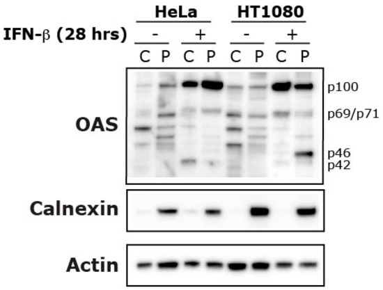 Cellular localization of OAS proteins in IFNβ treated HeLa and HT1080 cells. Cells were treated with 1000 U/mL IFN-β (+) for 28 h or left untreated (−) and harvested by centrifugation. The cells were lysed and fractionated into the cytosol (C) and the pellet (P). The P fraction contains proteins from mitochondria, endoplasmic reticulum, Golgi, and other internal organelles excluding the nucleus, which was separated in a centrifugation step. Protein extracts were subjected to immunoblot analysis using antibodies against the indicated proteins. The OAS antibody recognizes the different isoforms of OAS: OAS1 (p42 and p46), OAS2 (p69/p71), and OAS3 (p100).