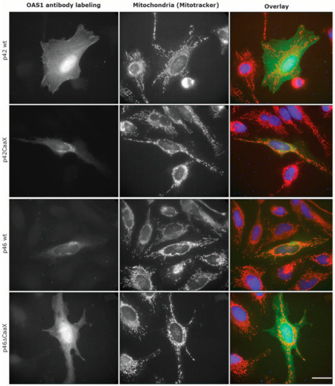 HeLa cells were seeded on poly-D-Lysine coated coverslips and transfected with plasmids encoding either p42, p42CaaX, p46, p46ΔCaaX, EGFPp42, EGFP46, or control plasmids using the PEI method (see above). After 28 h, 50 nM of Mitotracker Red CMXRos (Molecular Probes, Invitrogen, ThermoFisher Scientific, Roskilde, Denmark) was added to the cells for 20 min. Cells were then fixed with 4% paraformaldehyde, washed twice in PBS, permeabilized with 0.05% Triton X-100 for 10 min, washed twice with PBS and finally blocked with 3% BSA in PBS-T. The coverslips were then either incubated with a specific human OAS1 (13-4-10) antibody (1:500, a kind gift from Dr. Shawn P. Iadonato) followed by incubation with a FITC-conjugated anti-mouse antibody (1:250, Sigma-Aldrich) for the OAS1 expressing plasmids or no antibodies (for the EGFP constructs). Nuclei were stained with 20 μg/mL Hoechst 33342 (Invitrogen). The coverslips were mounted with Glycergel Mounting Medium (DAKO) containing 2.5% (w/v) antifade Dabco 33-LV (Sigma-Aldrich). Regular wide field epifluorescence microscopy was performed using a Nikon Ti Eclipse inverted microscope equipped with a motorized stage, a 100× objective, and the TI-ND6-PFS-S Perfect Focus System controlled by NIS-Elements software (Nikon, Ramcon A/S, Birkerød, Denmark). 12 bitimages were captured with a Zyla 5.5 sCMOS camera (Andor Technology Ltd., Belfast, UK). The epifluorescence light source was a pE-300white LED unit (CoolLED, Ramcon A/S, Birkerød, Denmark) and appropriate filter sets were used. The images were analyzed with ImageJ Fiji [26]. Brightness-contrast was adjusted differentially for for each image except for Supplementary Figure S4, in which the images were adjusted identically by setting the minimum displayer value to 800.