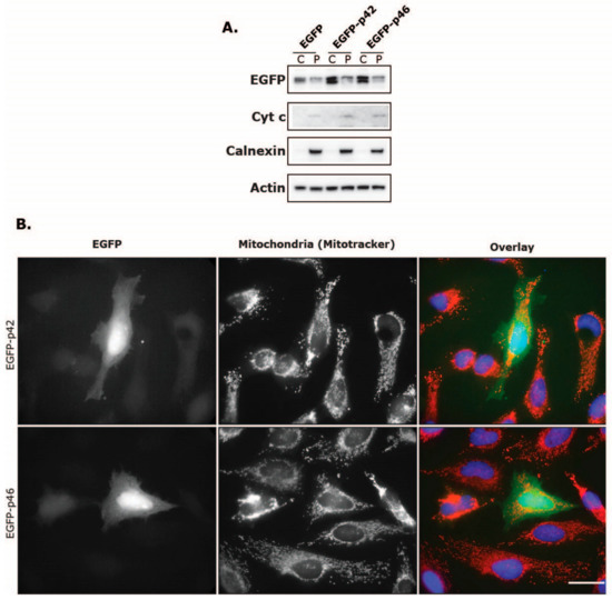 The C-terminal p46 CaaX motif cannot change the cellular localization of EGFP. HeLa cells were transfected with plamids encoding EGFP fused to either the p42 C-terminal end or the p46 C-terminal end, or a control EGFP expressing plasmid, as indicated. Twenty-eight hours after transfection, cells were (A) harvested by centrifugation for cell fractionation, or (B) stained with Mitotracker and subjected to immunocytochemistry analysis. (A) The cells were lysed and fractionated into the cytosol (C) and the pellet (P). The P fraction contains proteins from mitochondria, endoplasmic reticulum, Golgi and other internal organelles excluding the nucleus, which was separated in a centrifugation step. Protein extracts were subjected to immunoblot analysis using antibodies against the indicated proteins. (B) EGFP is green, the Mitotracker is red, and the nuclei were stained with Hoechst 33343 (blue) and are shown in the overlay pictures. The scale bar is 30 µm.