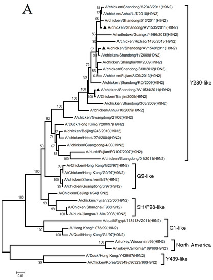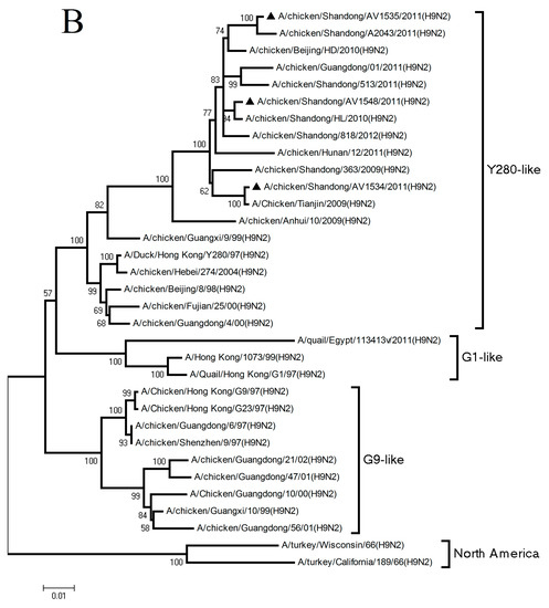 3.1. Phylogenetic Analysis of the Three H9N2 Viruses