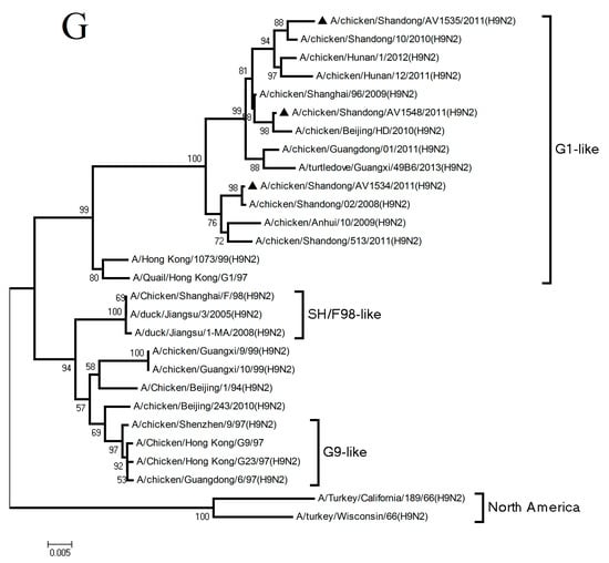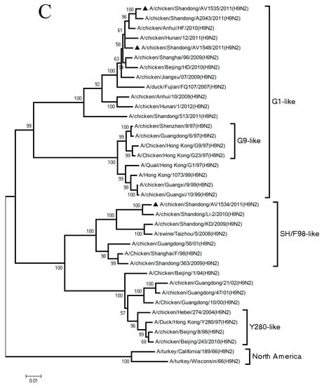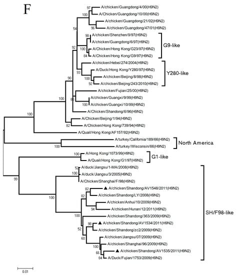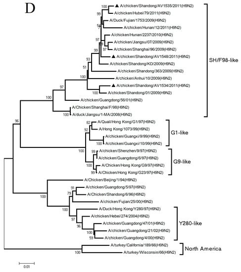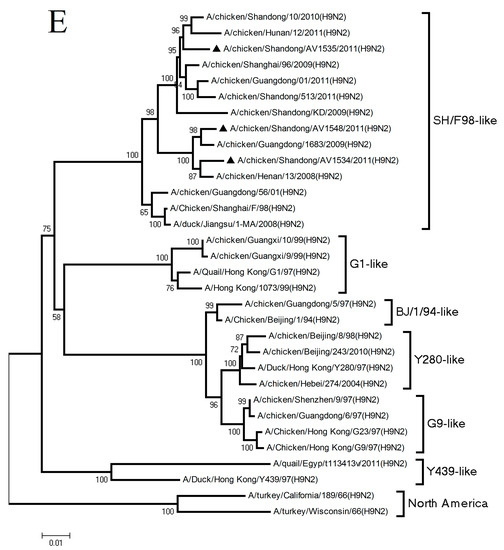 - Chen, F.; Yan, Z.Q.; Liu, J.; Ji, J.; Chang, S.; Liu, D.; Qin, J.P.; Ma, J.Y.; Bi, Y.Z.; Xie, Q.M. Phylogenetic analysis of hemagglutinin genes of 40 H9N2 subtype avian influenza viruses isolated from poultry in China from 2010 to 2011. Virus Genes 2012, 45, 69–75. [Google Scholar] [CrossRef]