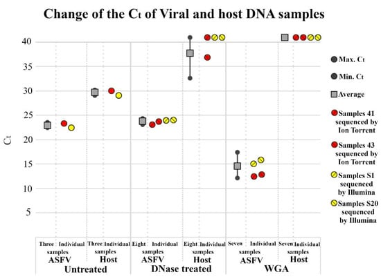 Host and viral DNA content of differently treated ASFV samples. Quantitative dual PCR was executed by Virotype ASFV PCR Kit. Ct values of individual and averaged samples represented by colored circles and grey box respectively. Averages were calculated from numbers of samples indicated on X axis. Gray circles indicate minimum and maximum values. Ct values higher than 40 (undetectable host DNA) are represented by 41. Whole genome amplification (WGA) was executed by REPLI-g Mini Kit.