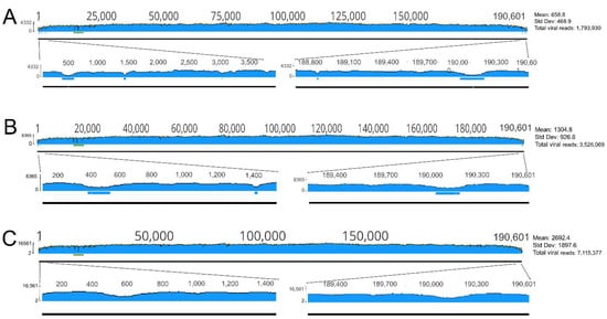 Graphical visualization of the nucleotide coverage values of the ASFV genome in sample S20. Horizontal blue bars represent regions with unsatisfying (<10) coverage in the terminal regions. Horizontal green bar labels the region with the three unresolvable C/G tracts. Numbers on the vertical scale indicate minimum and maximum coverage values. (A), data from a single channel; (B), data from two channels; (C) data from four channels.