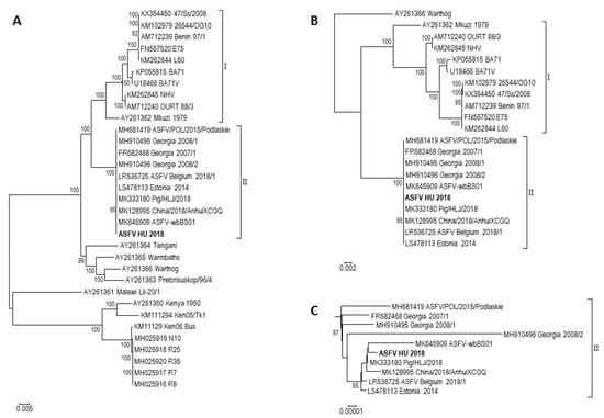 Phylogenetic analyses of complete ASFV genome sequences. The sequenced ASFV HU 2018 strain is highlighted using bold letters. Strains are represented using their NCBI Nucleotide accession numbers and their strain names. Genotypes I and II are marked. (A). Phylogenetic analysis of different ASFV genotypes. The tree was rooted on the midpoint. (B). Phylogenetic analysis of genotype I and II ASFV strains. The tree was rooted using strain Warthog as outgroup. (C). The subtree of genotype II strains shown separately from the phylogenetic analysis of genotype I and II ASFV strains.