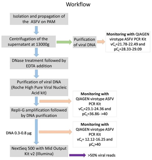 Workflow of the ASFV sequencing protocol. Major steps of the process are depicted together with key values for quality control to ensure successful reproduction. vCt, viral genome Ct (cycle threshold) value; pCt, pig genome Ct value.