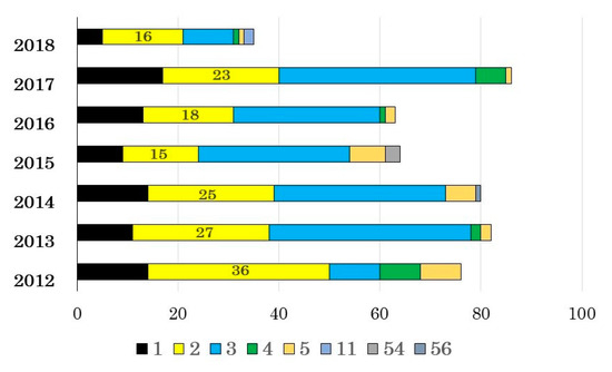 Adenoviruses (Ads) detected from respiratory patients during 2012 to 2018. The vertical axis shows the year, and the horizontal axis shows the number of Ads detected. Data from 2011 were not shown because only three strains were detected in 2011, Ad-1 (n = 2) and Ad-3 (n = 1).