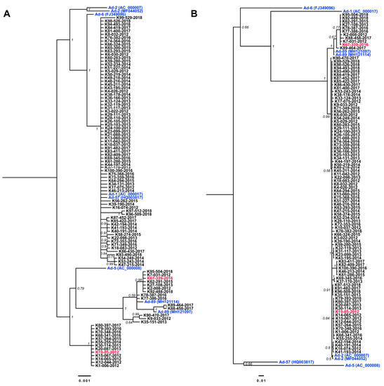 Phylogenetic trees of (A) the penton base RGD loop and (B) hexon loop 1. The posterior probability supporting the branching is shown at the tree nodes. Tip names are colored black for sequences obtained in the present study, blue for Ad-C reference sequences, and red for two samples used for whole-genome sequencing.