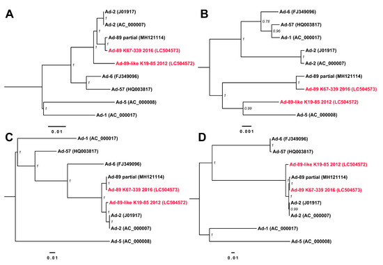 The phylogenetic tree of the genome sequences with other reference Ad-C sequences confirmed the classification of K67-339-2016 as Ad-89 at the genome level (Figure 3A). However, the highly supported position of K19-85-2012 was an outgroup to Ad-2 and Ad-89. Furthermore, the phylogenetic trees corresponding to the coding sequences of penton base, hexon, and fiber (Figure 3B–D) clustered K19-85-2012 with Ad-5, Ad-2, and Ad-2, respectively, summarized as P5/H2/F2.