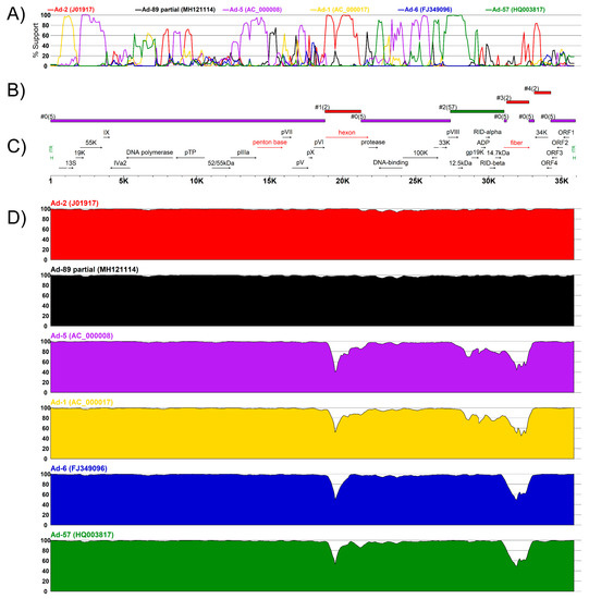 Partial and complete genome sequences of samples were compared to reference sequences retrieved from the INSDC. The accession numbers of the reference sequences were: Ad-1 (AC000017), Ad-2 (AC000007, MF044052), Ad-5 (AC000008), Ad-6 (FJ349096), Ad-57 (HQ003817), Ad-89 (MH121097, MH121114). Ad-B3 (AY599834) was used as an outgroup to root trees. Multiple sequence alignments (MSAs) including obtained sequences and the reference sequences of Ad-C were built with MAFFT [27] and the corresponding phylogenies were inferred with MrBayes v3.5 [28]. The best models were chosen by MSA using the corrected Akaike information criterion (AIC) calculated by MEGA (version 7) [29] and the Bayesian chain length was 2 × 106 to assure convergence. Recombination analysis was performed using SimPlot (version 3.5.1) [30] (with window and step sizes as 500 bp and 100 bp, respectively, and 100 repetitions) and the recombination detection program (RDP) v4.0 [31], setting the program to consider reliable recombination events with a significance of p < 0.01 in at least three out of seven selected methods: RDP, GENECONV, BootScan, Maxchi, Chimaera, SiSscan, and 3Seq.