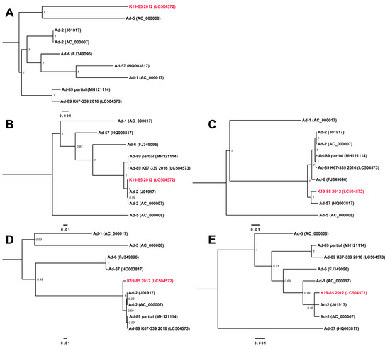 Phylogenetic trees considering the effects of detected recombination events. The Bayesian posterior probability supporting the branching is shown adjacent to the nodes. (A) Phylogenetic tree considering the section of the genome in K19-85-2012 detected as not recombinant with a length of 27,064 bp. Other phylogenetic trees correspond to sections of the genome for (B) event 1: 2527 bp, (C) event 2: 3685 bp, (D) event 3: 1527 bp, and (E) event 4: 1131 bp. See Table 2 and Figure 4B. Tip names of the recombinant genome sequences from the present study are colored in red.