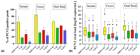 Detection of porcine circovirus type 2 (PCV2) in serum and fecal pools and in oral fluid samples from farms that do not vaccinate against PCV2 (NON-VAC) and from farms that vaccinate (VAC) using two different vaccination strategies: the vaccination of piglets (VAC1) or the vaccination of sows and their progeny (VAC2). (a) Percentage of PCV2-positive samples. Statistically significant differences (p < 0.05, Fisher’s exact test) are marked with superscripts on the tops of the bars in the chart (a, b, c, d). (b) Comparison of PCV2 viral loads (log10 copies/mL). The whisker plot uses a Tukey determination of whiskers. A statistical comparison was performed using the Mann–Whitney test. Statistically significant differences (p < 0.05) are marked with superscripts on the tops of the boxes in the chart (a, b, c, d).