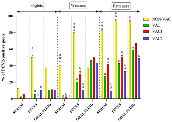 Percentage of porcine circovirus type 2 (PCV2) detection in serum and fecal pools and in oral fluid samples collected from piglets (3–4 weeks old), weaners (5–8 weeks old), and fatteners (≥9 weeks old) from farms that do not vaccinate against PCV2 (NON-VAC) and from farms that vaccinate (VAC) using two different vaccination strategies: the vaccination of piglets (VAC1) or the vaccination of sows and their progeny (VAC2). Statistically significant differences (p < 0.05, Fisher’s exact test) are marked with superscripts on the tops of the bars in the chart (a, b, c, d).