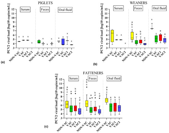 Comparison of porcine circovirus type 2 (PCV2) viral loads (log10 copies/mL) in serum and fecal pools and in oral fluids collected from piglets (a), weaners (b), and fatteners (c) from farms that do not vaccinate against PCV2 (NON-VAC) and farms that vaccinate (VAC) using two different vaccination strategies: the vaccination of piglets (VAC1) and the vaccination of sows and their progeny (VAC2). The whisker plots use a Tukey modification of whiskers. A statistical comparison was performed using the Mann–Whitney test. Statistically significant differences (p < 0.05) are marked with superscripts on the tops of the boxes in the chart (a, b, c, d), and “x” indicates diagnostic material that was not taken into account in the statistical comparison (too small a number of PCV2-positive samples).