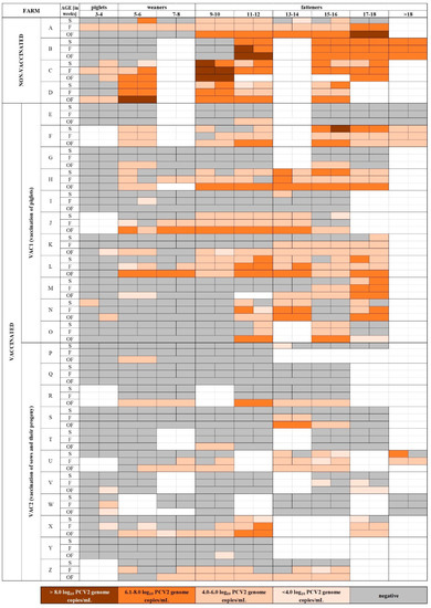 Detection of porcine circovirus type 2 (PCV2) in different materials (serum (S), feces (F), oral fluids (OFs)), age groups (piglets, weaners, and fatteners), and farms with different vaccination protocols against PCV2 (VAC1: piglet vaccination; VAC2: vaccination of sows and their progeny; NON-VAC: no vaccination). Positive pools are marked with orange cells. The negative pools are marked with gray cells. The white cells correspond to pools that were not collected. Positive samples were divided into four groups based on log10 PCV2 copy equivalents/mL of pool (>8.0, 6.1–8.0, 4.0–6.0, and <4.0 log10 copies/mL).