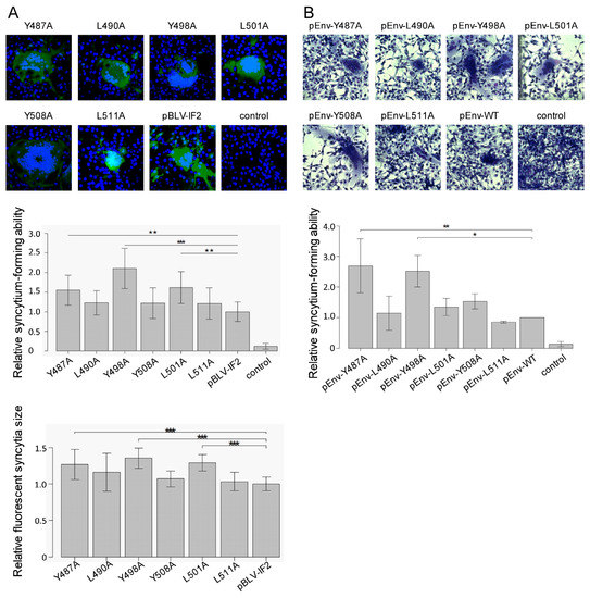 Effect on the syncytium-forming ability of mutant forms of an infectious molecular clone pBLV-IF2 and Env expression plasmid pEnv. (A) The luminescence syncytium induction assay (LuSIA) using CC81-GREMG cells. CC81-GREMG cells (8.0 × 105) were transfected with 2.8 µg of either wild-type pBLV-IF2, mutant pBLV-IF2, or control pBluescript II SK (−) together with 1.2 µg of Flag-mRFP using 14 µg of 25 kDa linear polyethylenimine and seeded at 2 × 105 cells/well in 24 well plates. At 20 h post-transfection, a fraction of cells was used to identify the ratio of RFP-expressing cells to determine the transfection efficiency. After two days post-transfection, the remaining CC81-GREMG cells were fixed, and nuclei were stained using Hoechst 33342. Fluorescent syncytia were observed using an FV-1000 fluorescence microscope (upper panel), or automatically scanned by EVOS2 fluorescence microscopy and counted computationally (middle panel). Shown are the relative numbers of fluorescent syncytia, which were normalized by the transfection efficiency and the number of cells. The fluorescence area of syncytia with EGFP was also measured using HCS Studio Cell Analysis software. Shown is the relative size of fluorescent syncytia, which were normalized by the size of pBLV-IF2 induced fluorescent syncytia for each experiment (lower panel). Each column and error bar represents the mean ± SD of fluorescent syncytia for four independent experiments. All values were analyzed by two-way ANOVA with Dunnett’s test. The asterisk indicates a statistically significant difference (* p < 0.05; ** p < 0.01, and *** p < 0.001). (B) Conventional syncytia formation assay using CC81 cells. CC81 cells (1.2 × 106) were transfected with 7.2 µg of either wild-type pEnv, mutant pEnv, or control pME-18neo together with 0.8 µg of pEGFP-N1 using a mixture of 12 µL Lipofectamine 3000 Transfection Reagent and 16 µL P3000 Enhancer Regent, and seeded at 1 × 106 cells in a 60 mm dish-and 2 × 105 cells in a 12 well plate. At 20 h post-transfection, cells in the 12 well plate were used to identify the ratio of GFP-expressing cells to determine the transfection efficiency. After two days post-transfection, CC81 cells in the 60 mm dish were fixed and stained with May–Grunwald solution and Giemsa solution. Syncytia were counted using a microscope (upper panel). Relative numbers of syncytia normalized by the transfection efficiency are shown (lower panel). Each column and error bar represents the mean ± SD of syncytia for three independent experiments. All values were analyzed by two-way ANOVA with Dunnett’s test. The asterisk indicates a statistically significant difference (* p < 0.05; ** p < 0.01, and *** p < 0.001).