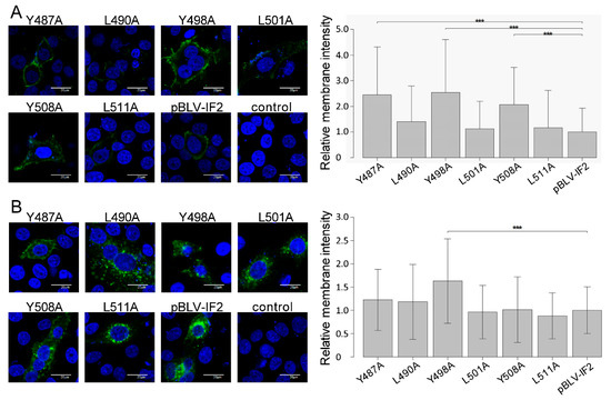 In the case of HIV, cell surface-associating Env protein can trigger cell–cell fusion [35]. Therefore, to gain insight into the mechanisms of the enhanced fusion activity of gp51 protein by each of the three tyrosine mutations in the three YXXL sequences, surface expression of the gp51 protein on HeLa cells following transient transfection with WT or mutant pBLV-IF2 was evaluated using indirect immunofluorescence analysis without TritonX-100 permeabilization, and the intensity differences of the two signal of cells analyzed by line scan measurements through each cell using FV10-ASW 4.02 microscopy software. Notably, all tyrosine mutations caused a drastic enhancement of fluorescence on the cell surface (Figure 3A, right). In contrast, HeLa cells transfected with any of the three leucine mutant pBLV-IF2s, such as L490A, L501A, and L511A, revealed slight fluorescence at the cell membrane as did cells transfected with WT pBLV-IF2. When fluorescence intensities on the cell surface were measured using FV10-ASW 4.02 microscope software, the intensity of gp51 detected at the cell surface in HeLa cells transfected with pBLV-IF2s encoding the three tyrosine mutants was significantly greater than that of HeLa cells transfected with pBLV-IF2 encoding WT or the three leucine mutants (Figure 3A, left).