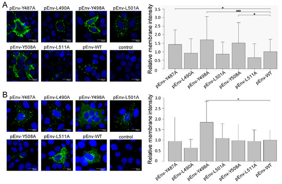Fluorescence intensity maps of Env protein in HeLa cells that were transfected with each pBLV-IF2 or pEnv expression plasmid were plotted by line scan measurements through each cell using FV10-ASW 4.02 microscopy software on a focal plane near the center of each nucleus, and peak membrane intensity was determined from these data, as shown in Supplementary Figure S1. The intensity of each cell was normalized by the mean intensity of WT for each experiment. Data were obtained for at least 50 cells.