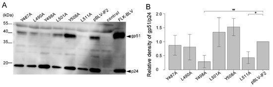 3.5. Y498A and L511A Mutants Interrupt the Incorporation of gp51 into Virions