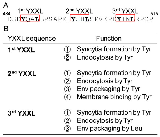 Furthermore, the results using an infectious molecular clone were confirmed by localization of Env protein without other viral proteins using an Env expression vector, as shown in Figure 4A,B. This result suggested that each tyrosine of the three YXXL sequences mediated Env localization without other viral proteins.