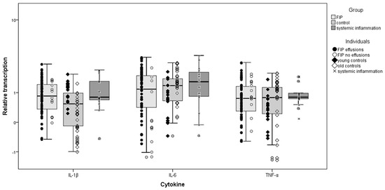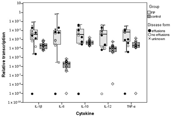 Comparison of relative cytokine transcription levels in the liver between cats with feline infectious peritonitis (FIP) and healthy, feline coronavirus (FCoV)-infected cats; box and whisker plots together with illustration of individual cat values and presence or absence of effusions in the case of FIP. ‘FIP’ includes Group 1.1a–natural FIP cases in the left-hand column of the box, and 1.1b–experimentally infected cats with FIP at the right-hand side; ‘control’ cats are Group 1.2–FCoV-infected cats without FIP. Boxes indicate the median value and the interquartile range, whilst whiskers indicate the spread of values with the exception of outliers (calculated by SPSS as >1.5 box lengths).