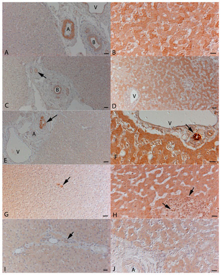 Representative immunohistological staining for the expression of cytokines in the liver. Left column: specific pathogen free (SPF) cats; right column: cats with FIP. (A,B): Expression of IL-1β. (A): In SPF cats, expression is restricted to bile duct (B) epithelial cells and the media of small arteries (A). V: vein in portal area. (B): In a FIP cat, hepatocytes exhibit variably intense expression. (C,D): Expression of IL-6. (C): In SPF cats, expression is restricted to a weak staining in bile duct (B) epithelial cells and the media of small arteries (arrow). (D): In a FIP cat, a large proportion of hepatocytes exhibit variably intense expression. V: vein in portal area. (E,F): Expression of IL-10. (E): In SPF cats, expression is restricted to bile duct epithelial cells (arrow). A: artery, V: vein in portal area. (F): In a FIP cat, hepatocytes exhibit a diffuse strong expression. The staining in bile duct epithelial cells (arrow) is even stronger. V: vein in portal area. (G,H): Expression of IL-12p40. (G): In a SPF cat, weak expression is seen within hepatocytes. Occasional positive Kupffer cells (arrow) are also seen. (H): In a FIP cat, hepatocytes exhibit a diffuse weak to moderate expression. In a granulomatous infiltrate, there are some weakly positive macrophages (arrows). (I,J): Expression of TNF-α. (I): In a SPF cat, very weak expression is seen within hepatocytes and bile duct epithelial cells (arrow). (J): In a cat with FIP, hepatocytes exhibit a diffuse weak staining. Bars represent 50 µm (A, C, D, E, and G) or 20 µm (B, D, H, I, and J) Peroxidase anti-peroxidase method, Papanicolaou’s haematoxylin counterstain.