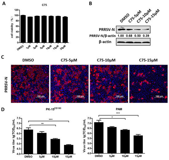 The pharmacological inhibitor (C75) inhibited porcine reproductive and respiratory syndrome virus (PRRSV) replication. (A) PK-15CD163 cells were incubated with various concentrations of C75 or DMSO, as a control, for 30 h for the 3-(4,5-dimethyl-2-thiazolyl)-2,5 diphenyl-2H-tetrazoliumbromide (MTT) assay to determinate the cytotoxicity of C75. (B) PK-15CD163 cells were pretreated with C75 at the indicated concentrations (5, 10, and 15 µM) for 6 h. The cells were then infected with PRRSV (MOI = 0.5) in the presence of indicated concentrations of C75 and harvested at 24 h post-infection (hpi) for western blot assay, using a specific antibody against PRRSV-N protein. β-actin was used as a loading control. (C,D) Indirect immunofluorescence assay (PRRSV-N, red; nuclei, blue) (C) and TCID50 assay (D) were separately performed to determine the expression levels of PRRSV-N protein, virus titers in PK-15CD163, or porcine alveolar macrophages (PAMs) treated with C75 as described in (B). Data are expressed as means and standard deviations from three independent experiments. *, 0.01 ≤ p < 0.05; **, 0.001 ≤ p < 0.01; ***, p < 0.001.