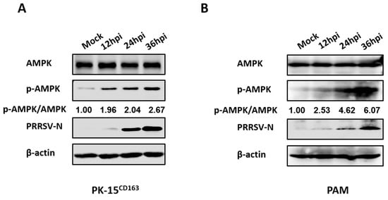 PRRSV infection upregulated AMPK phosphorylation levels. (A) PK-15CD163 or (B) PAMs were infected with PRRSV (MOI = 0.5) for 12, 24 or 36 h. Lysates were collected and analyzed by western blot assay for the levels of total AMPK, phosphorylated-AMPK (p-AMPK) and PRRSV-N protein. β-actin was measured as a loading control.