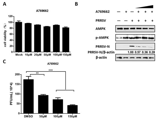 The above data demonstrated that PRRSV significantly activated AMPK, so we continued to investigate whether AMPK activation affects PRRSV replication. AMPK activator A769662 was selected for further research. First, the cytotoxicity of A769662 was evaluated with the MTT assay, which revealed that no obvious cytotoxicity was observed in PK-15CD163 cells treated with A769662 at concentrations below 150 µM, as seen in Figure 3A. Next, PRRSV-infected PK-15CD163 cells were treated with various concentrations of A769662. The results of western blot assay indicated that A769662 reduced PRRSV-N expression in a dose-dependent manner, as seen in Figure 3B. Likewise, the results of the plaque assay revealed an approximately four-fold decline in the number of plaques formed in A769662-treated cells compared with DMSO-treated cells, as seen in Figure 3C. Altogether, these data indicated that activated-AMPK had an antiviral effect on PRRSV in PK-15CD163 cells.