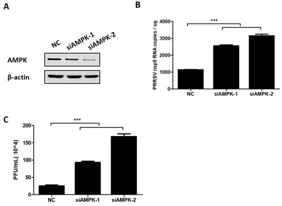 Knockdown of AMPK-enhanced PRRSV infection. (A) PK-15CD163 cells were transfected with AMPK-specific siRNAs (siAMPKs) or NC siRNA. At 36 h post transfection, cells were harvested to determine the knockdown efficiency through western blot assay. (B,C) PK-15CD163 were transfected with siAMPKs or NC siRNA. After 24 h, cells were infected with PRRSV (MOI of 0.5) and processed to detect the mRNA levels of the PRRSV NSP9 gene by qRT-PCR assay (B) and virus titers by plaque assay (C) at 24 hpi. The results represent the means and standard deviations from three independent experiments. ***, p < 0.001.