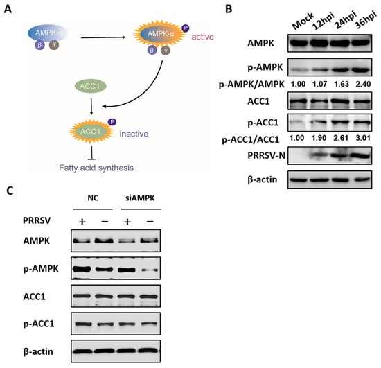 Acetyl-CoA carboxylase 1 (ACC1) activity is regulated by AMPK during PRRSV infection. (A) Model of fatty acid (FA) synthesis via the AMPK–ACC1 pathway. The levels of phosphorylated ACC1 (inactive form) were enhanced by active AMPK, resulting in inhibitory FA synthesis. (B) PK-15CD163 cells were infected with PRRSV (MOI = 0.5) for 12, 24, or 36 h. Lysates were collected and tested by western blot assay for the levels of total AMPK, p-AMPK, total ACC1, phosphorylated ACC1 (p-ACC1), and PRRSV-N protein. β-actin was measured as a loading control. (C) PK-15CD163 cells were transfected with AMPK-specific siRNAs or control siRNA (NC) for 24 h and infected with PRRSV (MOI = 0.5) for 24 h for western blot analysis.
