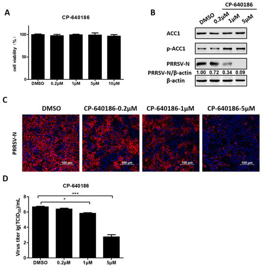 CP-640186 an ACC1-specific pharmacological inhibitor, inhibited PRRSV infection. (A) PK-15CD163 cells were incubated with various concentrations of CP-640186 or DMSO as a control for 30 h for MTT assay. (B) PK-15CD163 cells were pretreated with CP-640186 at various concentrations (0.2, 1, and 5 µM) for 6 h prior to PRRSV infection (MOI = 0.5). The infected cells were cultured in the presence of indicated concentrations of CP-640186 and harvested at 24 hpi for western blot analysis using a specific antibody against PRRSV-N protein, and β-actin was used as a loading control. (C) The distribution of PRRSV-N protein (red) and nuclei (blue) in PRRSV-infected PK-15CD163 cells was evaluated by confocal microscopy at 24 hpi. (D) Virus titers were detected by TCID50 assay. Data are expressed as means and standard deviations from three independent experiments. *, 0.01 ≤ p < 0.05; ***, p < 0.001.