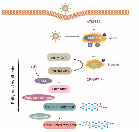 Model of PRRSV-mediated manipulation of the AMPK–ACC1 pathway. Acetyl-CoA is metabolized to malonyl-CoA via ACC1, which is then transformed into palmitates by FA synthase (FASN). Palmitates are prolonged through FA elongase to form saturated FAs, which are subsequently metabolized to unsaturated FAs by desaturase. PRRSV infection activated AMPK, thus resulting in an increased level of phosphorylated ACC1 (inactive form) to block FA synthesis. Pharmacological agents targeting various steps of FA synthesis pathway, such as C75 (inhibitor of FASN), CP-640186 (inhibitor of ACC1), and A769662 (activator of AMPK), suppressed FA biosynthesis and subsequently inhibited the replication of PRRSV. In summary, host cells limit PRRSV infection via the AMPK–ACC1 pathway.