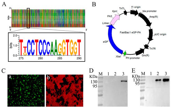 Construction and detection of a recombinant baculovirus. (A) Eighteen SUDVsequence logo of differences and preference characteristics. (B) Schematic of the recombinant baculovirus expressing the SUDV eGP-PA fusion protein. (C) IFA detection of eGP-PA expression in baculovirus-infected Sf9 insect cells (magnification of microscopy images, 200×). Cells were infected with the recombinant baculoviruses in (a) and were mock infected in (b). (D) WB analysis of antibody specificity. M: molecular weight marker; Lane 1: Marburg virus (MARV) virus-like particles; Lane 2: EBOV bacterium-like particles; Lane 3: recombinant baculovirus (rBV-eGP-PA)-infected Sf9 cell lysate. (E) WB analysis of eGP-PA fusion protein expression format. M: molecular weight marker; Lane 1: culture medium supernatant; Lane 2: precipitate following supersonic schizolysis; Lane 3: supernatant following supersonic schizolysis.