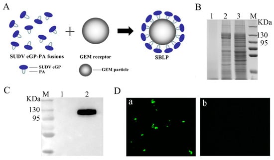 The production process for SBLP is shown in Figure 2A. A cell-free extract containing eGP-PA was mixed with GEM particles, and, after washing, the particles were subjected to SDS-PAGE analysis (Figure 2B). Analysis by Quantity One indicated that 1 U of GEM particles could bind approximately 65.2 μg of the eGP-PA fusion protein (data not shown). The surface location of eGP-PA on the GEM particles was also analyzed by WB (Figure 2C) and IFA (Figure 2D) with anti-SUDV-GP1 monoclonal antibody. The WB results showed that the eGP-PA fusion protein was bound to GEM particles. Moreover, microscopic observation indicated that, compared with the GEM particles alone, the combination of the GEM particles and eGP-PA fusion protein emitted strong green fluorescence. Therefore, the above results indicated that the eGP-PA fusion protein was anchored to GEM particles.