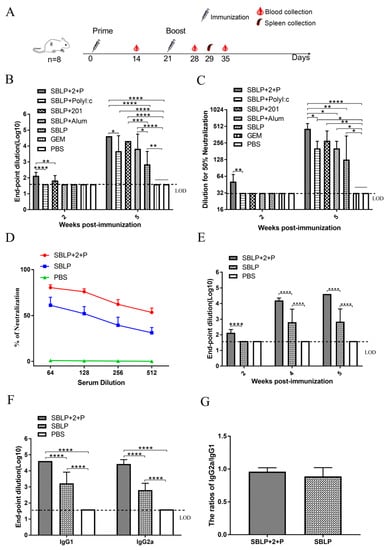 Serum antibody responses induced by SUDV SBLP. Serum samples were collected by retro-orbital plexus puncture at weeks 2, 4, and 5. EBOV GP-specific total IgG, IgG1, and IgG2a antibody responses were measured by indirect ELISA with the purified GP protein and are displayed as the end-point dilution titers. The horizontal dotted line in the figure indicates the limit of detection (LOD). n = 8 mice/group/time point. Data are shown as the mean ± SD and were analyzed by one-way ANOVA. * p < 0.05, ** p < 0.01, *** p < 0.001, **** p < 0.0001. (A) Schematic of the experiment. (B,C) Analysis of serum antibody titers induced by different adjuvants by ELISA and neutralization of SUDV GP-pseudotyped virus. Neutralizing antibody titers were measured with Huh7 cells and 100× TCID50 of pseudotyped virus. (D) Neutralization of the SUDV GP-pseudotyped virus. Serum samples were collected at 2 weeks after the second immunization. (E) Total anti-SUDV IgG antibody titers of SBLP with ISA 201VG plus Poly (I/C) and SBLP immunized mice at weeks 2, 4, and 5. (F) Serum anti-SUDV antibody subclass responses detected at 2 weeks after the second immunization. (G) Ratios of IgG2a/IgG1.