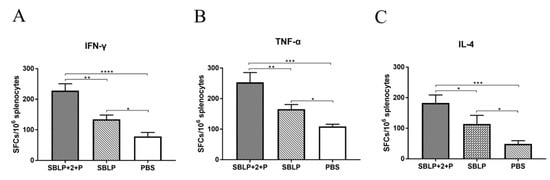 After confirming that SBLP with ISA 201VG plus Poly (I:C) successfully induced an enhanced antibody responses in mice, we next evaluated the T-cell responses in mice following vaccination. The IFN-γ, IL-4, and TNF-α secretion by mouse splenocytes was measured in ELISpot assays. As shown in Figure 4, the SFCs indicative of IFN-γ, IL-4, or TNF-α production by splenocytes from mice immunized with SBLP with ISA 201VG plus Poly (I:C) were significantly more than those from mice immunized with SBLP, indicating that both the Th1 and Th2 arms of adaptive immunity were activated.