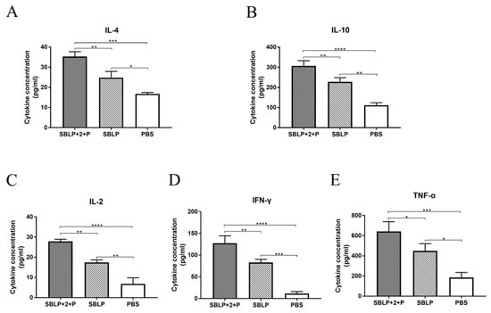 To further investigate antigen-specific cellular immune responses, the cytokines secreted by splenocytes were assayed using commercial ELISA kits. The levels of the cytokine IL-2, IL-4, IL-10, IFN-γ, and TNF-α secreted by splenocytes from the mice in the SBLP with ISA 201VG plus Poly (I:C) or SBLP alone group were significantly higher than those secreted by splenocytes from the mice in the PBS group (Figure 5). The secretion of IFN-γ, TNF-α, and IL-2 was associated with a Th1 profile, whereas the secretion of IL-4 and IL-10 were associated with a Th2 immune response. These data demonstrated that the SBLP vaccine enhanced the secretion of both type 1 cytokines and type 2 cytokines in splenocytes, especially in the presence of adjuvants.