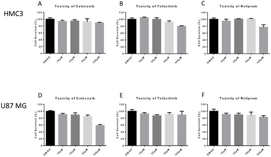 Drug Toxicity. Human microglial (HMC3) and astrocyte (U87 MG) cells were seeded at the appropriate density for the given cell line and incubated for 24 h. Cells were then overlaid with media containing indicated concentrations of each drug for 24 h. CellTiterGlo luminescence assay was used to determine cell viability. (A) Toxicity of celecoxib in HMC3s; (B) Toxicity of Tofacitinib in HMC3s; (C) Toxicity of Rolipram in HMC3s; (D) Toxicity of Celecoxib in U87 MGs; (E) Toxicity of Tofacitinib in U87 MGs; (F). Toxicity of Rolipram in U87 MGs. The quantitative data are depicted as the mean of three biologically independent experiments ± SD.
