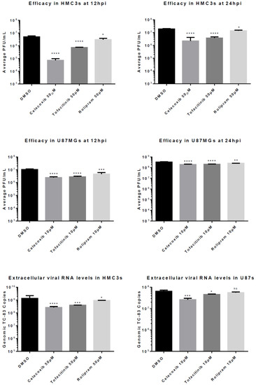 Additionally, RNA from U87 MG and HMC3 infected cells was collected at 24 hpi for analysis by qRT-PCR to determine reduction in levels of genomic viral RNA following inhibitor treatment. At 24 hpi, extracellular genomic copies in inhibitor-treated HMC3s demonstrated similar reduction to that observed by plaque assay (Figure 2E–F). In HMC3s Celecoxib, Tofacitinib, and Rolipram reduced titers approximately 5-fold (p < 0.0001), 3-fold (p < 0.001) and 1.5-fold (p < 0.05), respectively, when compared to DMSO-treated cells.