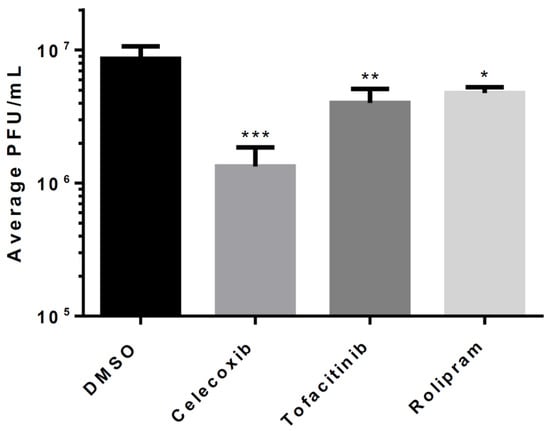 We next tested the efficacy of the inhibitors against the wild-type TrD strain of VEEV. HMC3s were pre-treated with 0.1% DMSO or one of the anti-inflammatory drugs at a concentration of 50 µM. Supernatants were collected at 18 hpi and infectious viral titers were determined by plaque assay (Figure 3). Similar to results obtained following TC-83 infection, Celecoxib demonstrated the greatest efficacy in controlling viral replication. Titers in treated cells were 6.45-fold lower when compared to the untreated cells (p < 0.0001), suggesting that the inhibitory effect of Celecoxib is effective against virulent strains of VEEV. Tofacitinib and Rolipram were less effective at controlling VEEV replication than Celecoxib. However, a statistically significant 2- to 3-fold reduction in replication was observed following Tofacitinib (p < 0.001) or Rolipram (p < 0.05) treatment when compared to DMSO-treated cells.