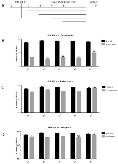 Post-exposure efficacy of inhibitors. HMC3s were infected with TC-83 (MOI = 0.1) for 1 hr. Viral inoculum was then removed, cells were washed with Dulbecco’s phosphate-buffered saline (DPBS) and fresh media was replaced. At 2 h intervals, DMSO or inhibitors at indicated concentrations were added to the media overlay. Supernatants were collected at 24 hpi and analyzed for infectious viral particles by viral plaque assay. (A) Schematic of the experimental design; (B) Efficacy of Celecoxib (50 µM); (C) Efficacy of Tofacitinib (50 µM); (D) Efficacy of Rolipram (50 µM). The quantitative data are depicted as the mean of three biologically independent experiments ± SD. * p < 0.05; ** p < 0.01; *** p < 0.001; ****p < 0.0001.