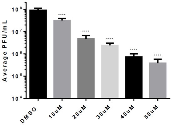 Efficacy against VEEV TrD. HMC3s were pre-treated with DMSO or inhibitors at indicated concentrations, infected with VEEV TrD (MOI = 0.1), and supernatants were collected at 16 hpi. Viral plaque assay was used to determine infectious viral titers. The quantitative data are depicted as the mean of three biologically independent experiments ± SD. * p < 0.05; ** p < 0.01; *** p < 0.001; **** p < 0.0001.