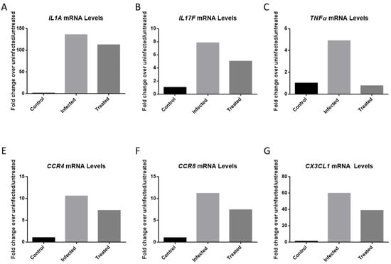 VEEV infection results in the upregulation of many pro-inflammatory cytokines that can damage the blood-brain barrier which can lead to permanent damage to the central nervous system [9,10]. Elevated cytokine levels can result from microglia activation in response to a viral infection [25]. Cytokine levels from infected, inhibitor-treated and mock infected HMC3 samples were measured at 12 hpi. Cells were pre-treated for 2 h with 50 µM of Celecoxib, and subsequently infected with VEEV TC-83 (MOI = 0.1). The results demonstrate the upregulation of several cytokines following VEEV infection, which was reduced following treatment of infected cells with Celecoxib. The highest mRNA inductions were observed for IL1A, IL17F, CCR4, CCR8, CX3CL1 and TNFα (Figure 6).