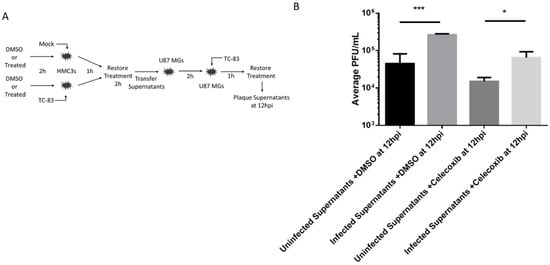 It has been previously shown that HMC3 microglia release cytokines after being exposed to TC-83 and make the surrounding environment more susceptible to viral infection [14]. Here, we evaluated celecoxib’s ability to modulate such an inflammatory environment and the resulting infection. HMC3 were treated with DMSO or 10 µM of celecoxib for 2hrs. Treatment was removed and cells were infected with TC-83 (0.1 MOI) for one hour. Infection was removed and cells were washed with DPBS. Treatment was replaced for two hours. Supernatants were then removed and transferred to naïve U87 MGs that had been treated with celecoxib 10 µM or DMSO for two hours. After the U87 MGs incubated for two hours, supernatants were removed and cells were infected with TC-83 for 1 h. Infection was removed, cells were washed with DPBS, and fresh DMSO of celecoxib containing media was replaced. At 12 hpi, supernatants were removed and viral titers were determined by plaque assay (Figure 7). It was shown that U87 MGs produce a lot more virus after being exposed to primed HMC3 supernatants. Celecoxib was able to significantly reduce viral titers in U87 MGs after being primed with HMC3 supernatants.