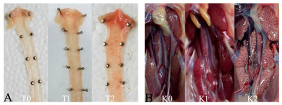 These chickens that died during the experimental period in each group were necropsied immediately, and the survival birds in each group were euthanized and necropsied at 8 DPC. Samples of the trachea and kidney were collected and saved in 10% neutral formalin for 24 h, embedded in paraffin, and stained with hematoxylin and eosin (HE) before being observed under a standard light microscope. Gross lesions of trachea were scored as follows: 0 points, normal; 1 point, abundant mucus and minor bleeders in the trachea; and 2 points, large hemorrhage in the trachea (Figure 1). Gross lesions of the kidney were scored as follows: 0 points, normal; 1 point, kidney swelling; and 2 points, mottled kidney (Figure 1). The mean lesion scores (MLS) in the trachea and kidney were calculated for each group.