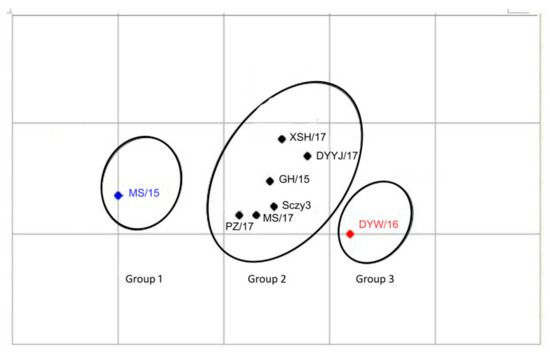 The seven QX-type isolates were classified into the same serotype as the Sczy3 strain, a representative strain of the SCZY3-serotype identified as the predominant serotype in Southwestern China during 2012–2016 [12,25]. Therefore, seven QX-type isolates could be clustered into the SCZY3-serotype, but the XSH/17 strain showed a loose relatedness with Sczy3 (0.11 ≤ R < 0.32) (Table 3). Of these seven IBV isolates, MS/15 and GH/15 showed a loose relatedness with DYW/16 (0.11 ≤ R < 0.32) (Table 3). AntigenMap analysis showed that eight QX-type strains (including Sczy3) could be classified into three antigenic subgroups: six IBVs including the five IBV field isolates MS/17, XSH/17, DYYJ/17, GH/15, and PZ/17 and Sczy3 strain were grouped into subgroup 2, while MS/15 while MS/15 strainwas placed in subgroup 1 and DYW/16 strain belonged to subgroup 3 (Figure 3).