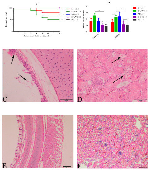 At 2–3 DPC, infected chickens in all groups began to display clinical symptoms such as sneezing, listlessness, and huddling. Different morbidity rates were observed in different groups: DYW/16, GH/15, MS/17, and DYYJ/17 showed 100% morbidity, and PZ/17 showed 70% morbidity. Dead chickens were observed in DYW/16, GH/15, and MS/17 groups at 3–6 DPC, whereas no dead chickens were observed in DYYJ/17 and PZ/17 groups (Figure 4A).The percentage survival of DYW/16isolates was 50% during the eight-day observation period. Significant differences were analyzed between DYW/16 group and group of DYYJ/17 and PZ/17 (p < 0.05). Survival rates of MS/17 and GH/15 isolates were 70% and 80%, respectively. There were no clinical symptoms or deaths observed in the control group birds.