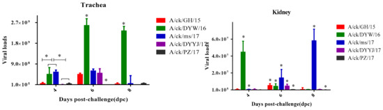 The viral load in the trachea and kidneys from the infected groups are shown in Figure 5. For the DYW/16 strain, the tracheal viral load peak was observed at six DPC, and the kidney viral load peak was observed at four DPC. The viral loads of the DYW/16 strain in the trachea were significantly higher than other strains at 6–8 DPC (p < 0.05), and the viral loads in the kidney was significantly higher than other strains at four DCP. For the MS/17 strain, the peak of tracheal viral loads was six DCP, but the most virus loads of kidneys at eight DCP. The viral loads of the MS/17 strain were higher than other strains in infected chicken kidneys at 6–8 DCP (p< 0.05). For the GH/15, PZ/17, and DYYJ/17 strains, the viral loads in the trachea and kidney peaked at six DCP. In terms of total viral loads in the trachea and kidney, the DYW/16 strain showed higher values than other strains in the trachea, and the MS/17 strain showed higher values than other strains in the kidney. The viral loads of the DYYJ/17 in the trachea strain were lower than that of other strains, and the viral loads of the PZ/17 strain in the kidney were the lowest during the experiment period.