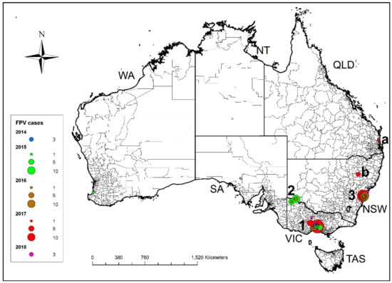 Distribution of cases of FPL reported in Australia between 1 January 2014 and 31 August 2018 by region and year of diagnosis. The first two outbreaks in Victoria occurred in 2014 in Melbourne (1) and in 2015 in Mildura (2). The third outbreak occurred in Sydney in December 2016 (3). Isolated cases were detected as far north as Nambour in Queensland (a) and in north western NSW in Gunnedah (b).