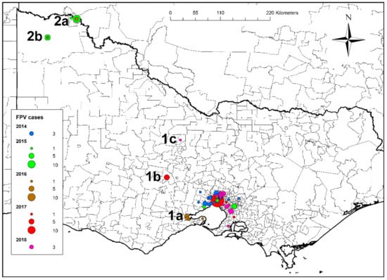Distribution of cases in Outbreaks 1 and 2 from Victoria, Australia, showing expansion of the geographic area of FPL outbreaks originating in Melbourne from 2014 to 2018, including to Geelong in 2016 (1a), Bendigo in 2017 (1b) and Daylesford in 2018 (1c). Cases from the Mildura region outbreak were centred around the townships of Mildura (2a) and Benetook 2(b).